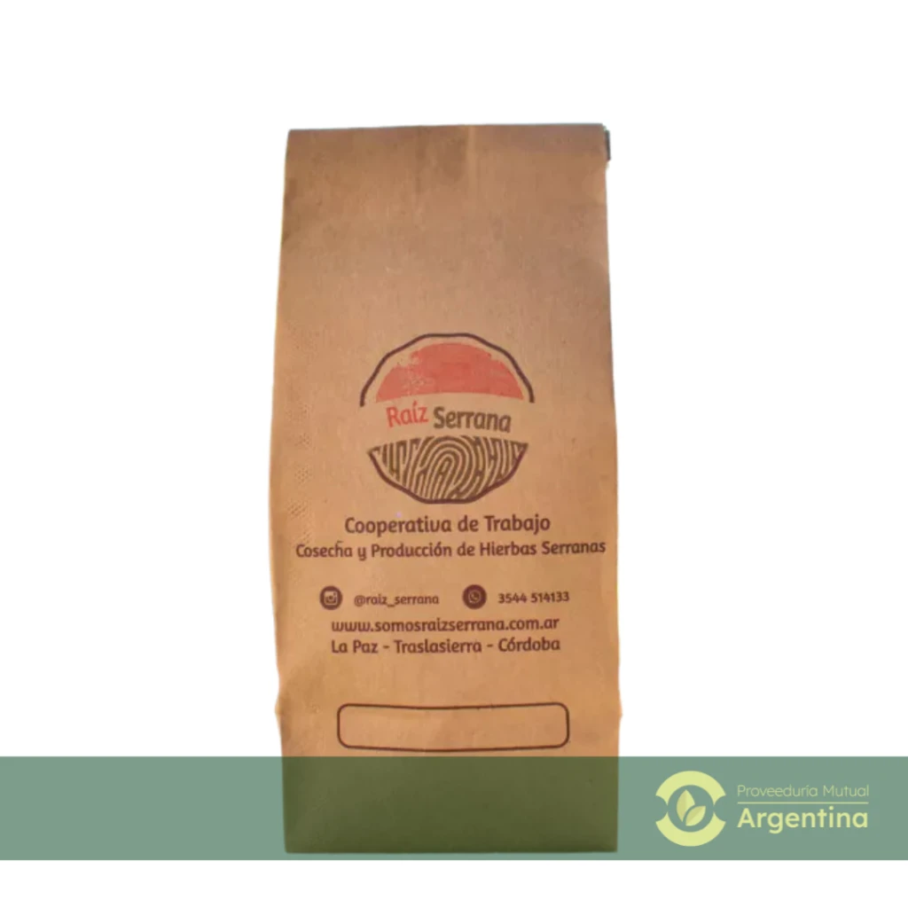 Origen: La Cooperativa de Trabajo Raíz Serrana Ltda. tiene como horizonte la sustentabilidad ambiental, el beneficio social y la calidad alimentaria. Instalada en La Paz, Traslasierra Córdoba, donde las hierbas se utilizan ancestralmente como alimento y complemento para la salud. Las hojas, tallos, raíces y flores se cosechan de forma equilibrada en las sierras y en el llano, protegiendo la diversidad de las especies. Todas sus hierbas son procesadas en la Reserva Natural “Los mates”, que forma parte de la red de reservas privadas de Argentina. Más info: https://raizserrana.com