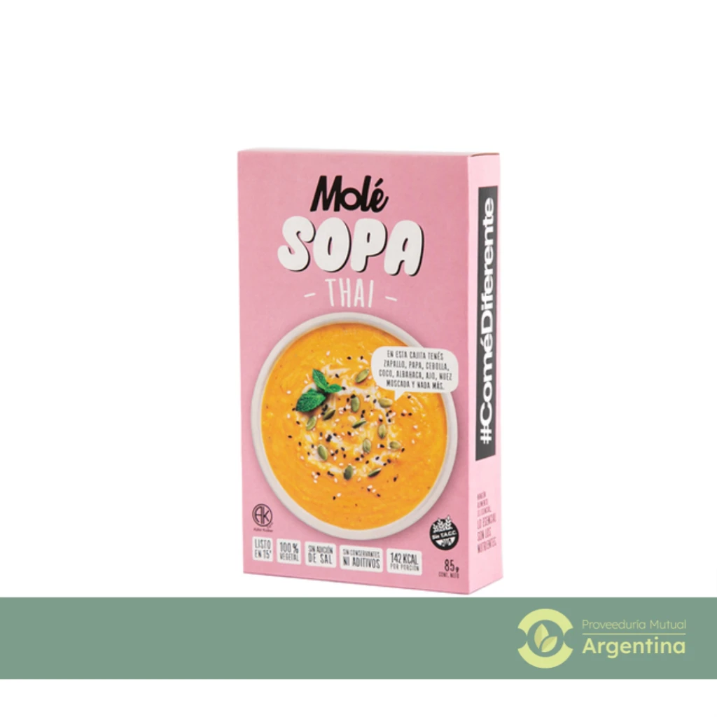 Pre mezcla para preparar Sopa Thai. Ingredientes: Zapallo deshidratado, papa deshidratada, cebolla deshidratada, coco deshidratado, albahaca deshidratada, ajo deshidratado y nuez moscada. Apto Vegano. Apto Kosher. Apto celìaco
