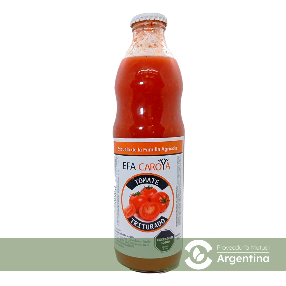 Tomate triturado envasado en botella de vidrio, producido por la comunidad educativa de la Escuela de la Familia Agrícola (EFA) de Colonia Caroya.